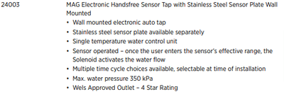 MAG Electronic Wall Mounted Sensor Tap with S/Steel Wall Plate - 140mm Straight Outlet - Code: 24003